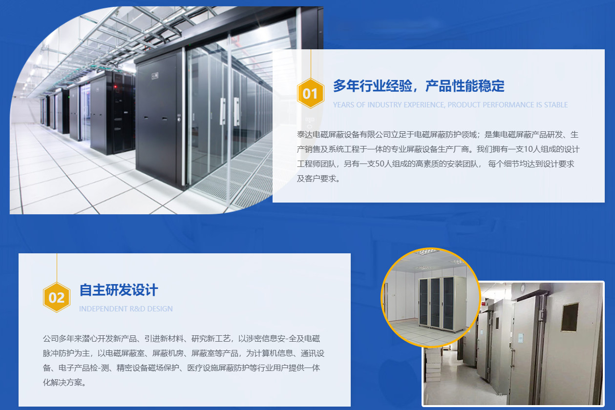 南陽市泰達(dá)電磁屏蔽設(shè)備有限公司一家專業(yè)從事高性能電磁屏蔽室、屏蔽機(jī)房、屏蔽室、電磁屏蔽機(jī)房、屏蔽門等設(shè)備的開發(fā)、生產(chǎn)、安裝的專業(yè)企業(yè)。目前我公司以擁有國內(nèi)較好的電磁兼容科研人員和高素質(zhì)的現(xiàn)場安裝力量,我公司有員工20余名包括技術(shù)、設(shè)計3名,我們的屏蔽機(jī)房已得到用戶好評。公司生產(chǎn)的屏蔽機(jī)房及屏蔽設(shè)備效能穩(wěn)定,使用方便,美觀大方,并能有效抑制工業(yè)和空間電磁場對室內(nèi)電子設(shè)備的干擾,防止機(jī)密電磁信息的泄露,它廣泛應(yīng)用于電子通訊、產(chǎn)品的生產(chǎn)調(diào)試、故障搶修、計量電磁、兼容測試,計算機(jī)、醫(yī)療設(shè)備、人防…